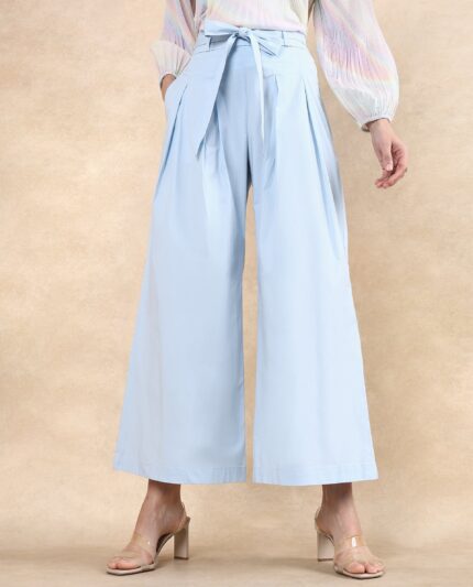 Rareism Women Sebern Light Blue Cotton Blend Fabric Button Closure Flared Ankle Length Plain Trouser