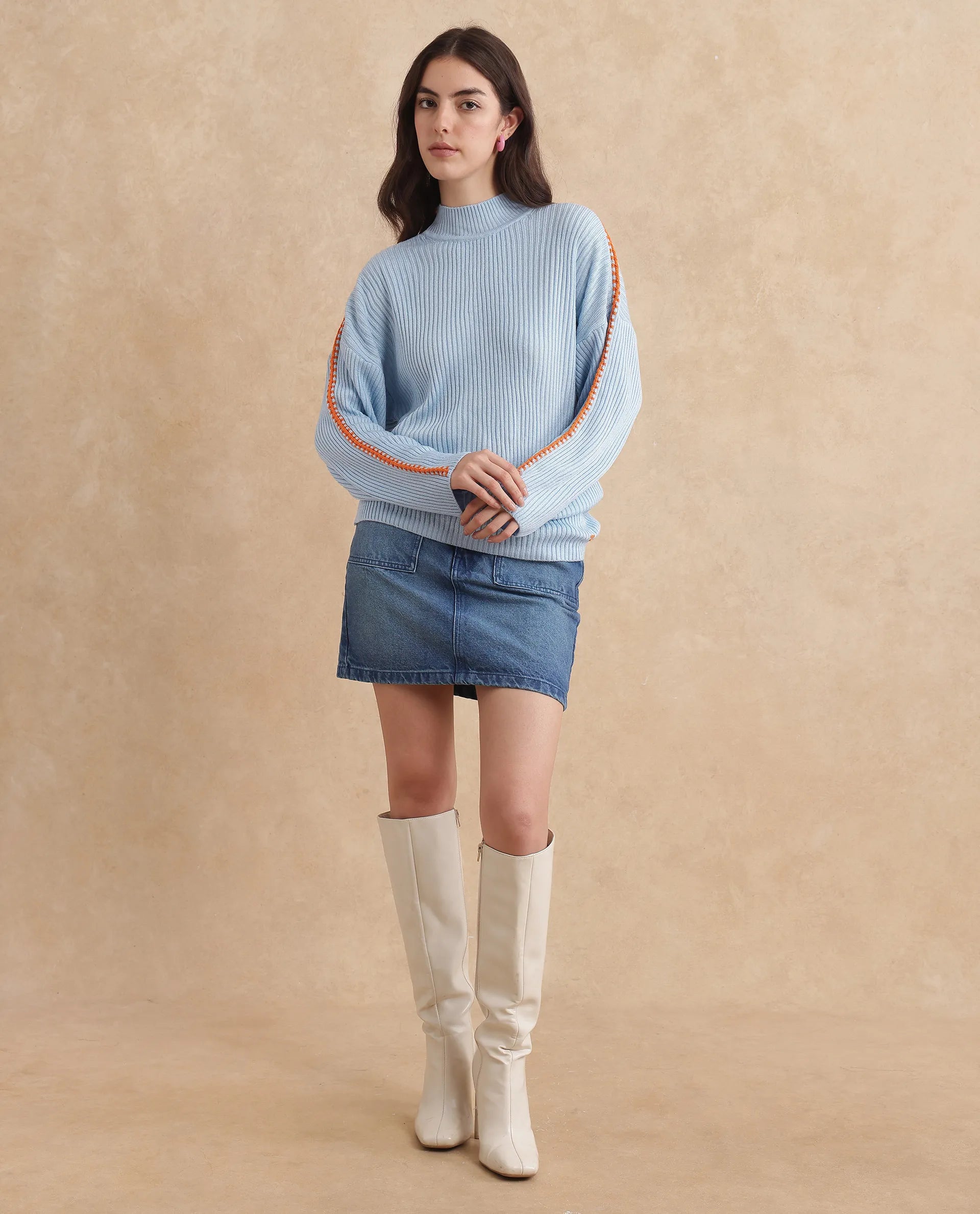 Rareism Women Cassiopiea Light Blue Acrylic Fabric Relaxed Fit Plain Sweater