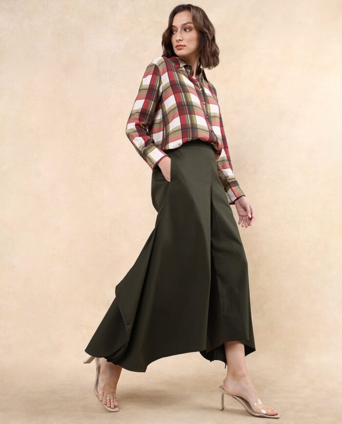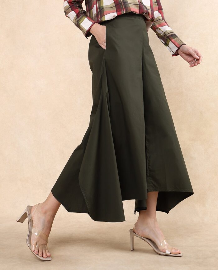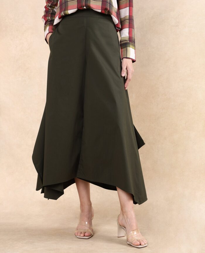 2. Features an elegant ankle-length cut with a unique asymmetric flared hem
