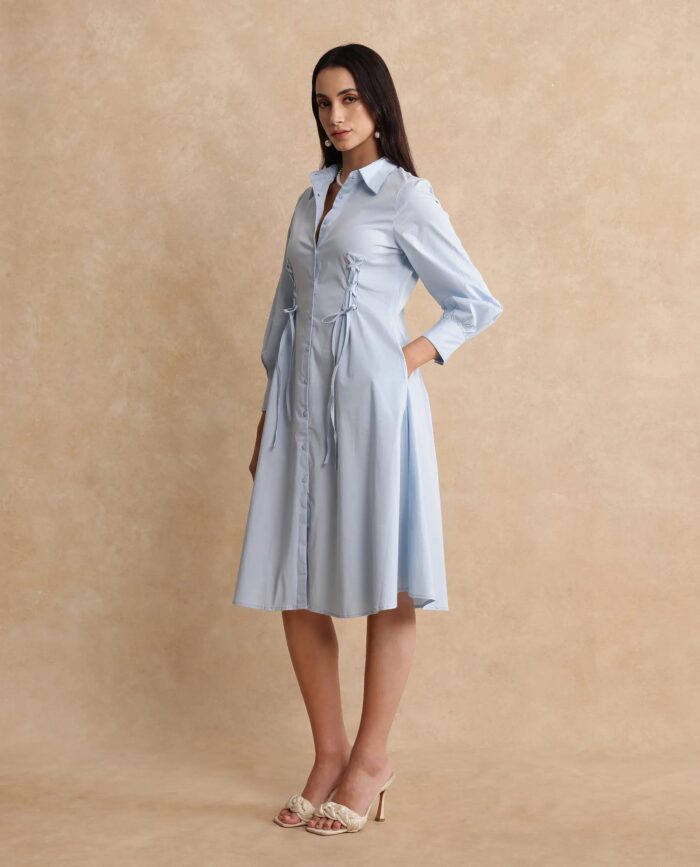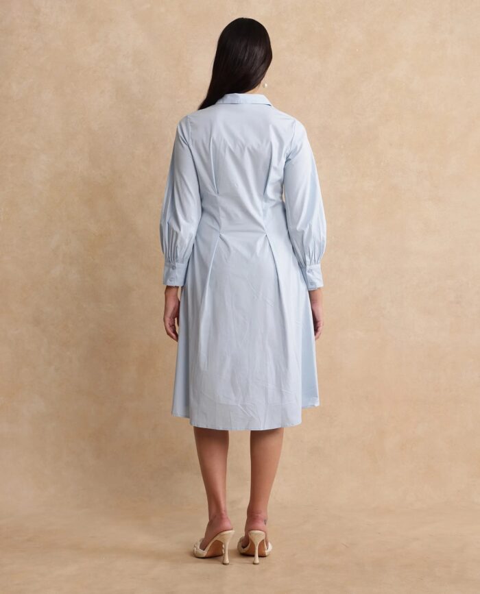 Rareism Women Nysom Light Blue Cotton Blend Fabric Bishop Sleeve Collared Neck Button Closure Fit And Flare Midi Plain Dress