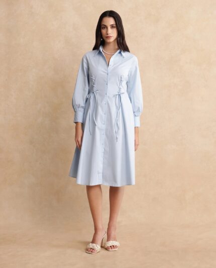 Rareism Women Nysom Light Blue Cotton Blend Fabric Bishop Sleeve Collared Neck Button Closure Fit And Flare Midi Plain Dress
