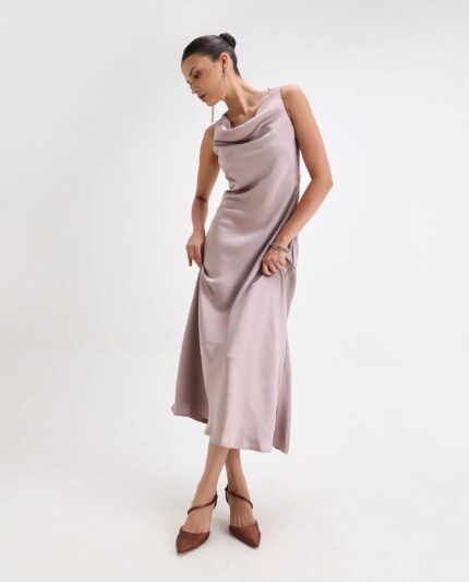 Rareism Women Zarina Dusky Beige Sleeveless Cowl Neck Zipper Closure Bodycon Maxi Plain Dress
