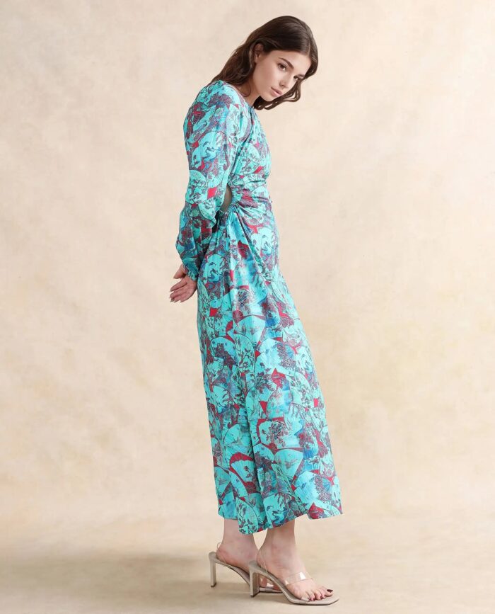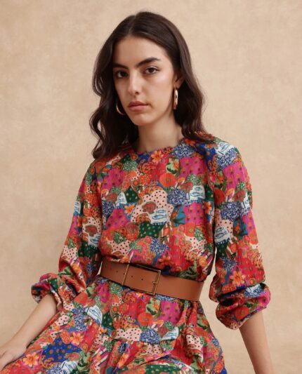 Rareism Women’s Eritram Multi Viscose Fabric Crew Neck Puff Sleeve Abstract A-Line Maxi Dress