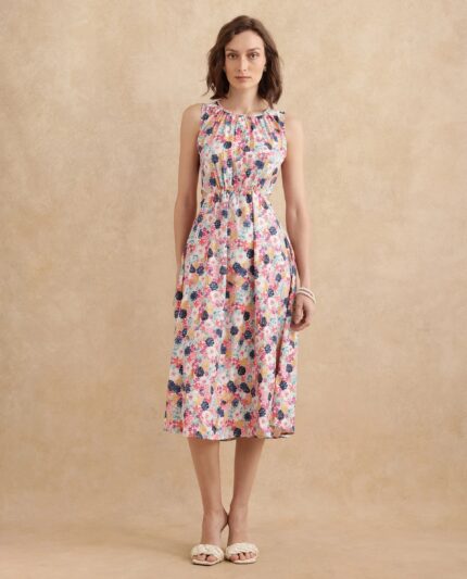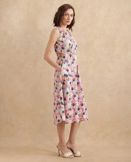 Rareism Women’s Rinaf Multi Satin Fabric Round Neck Button Closure Sleeveless Floral Print Fit And Flare Midi Dress