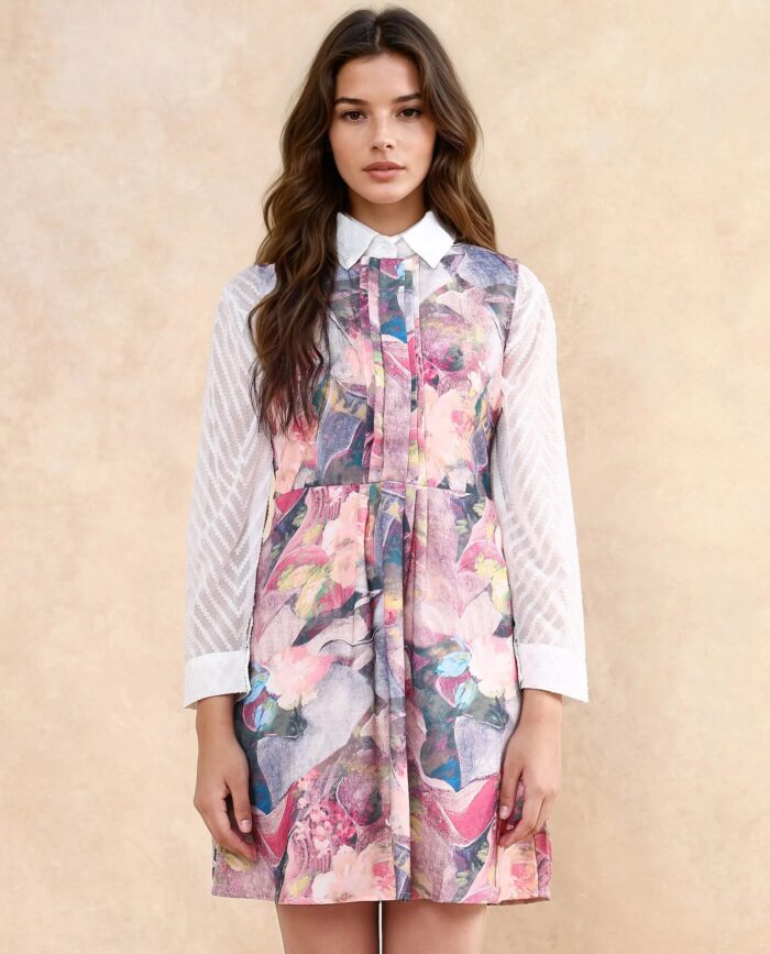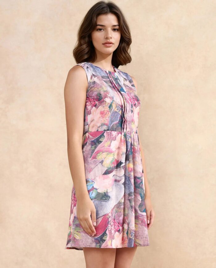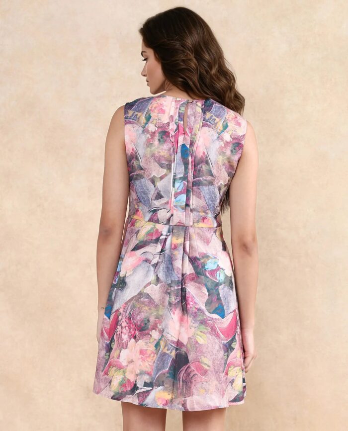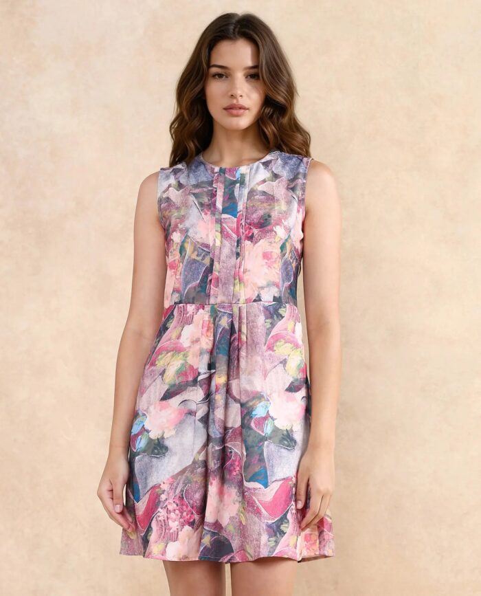 Rareism Women’s Rouxi Multi Polyester Blend Fabric Crew Neck Button Closure Sleeveless Abstract Fit And Flare Mini Dress